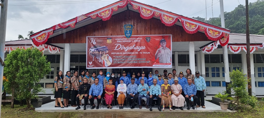 Indonesia merayakan HUT RI ke -76 tahun, hari ulang tahun ini masih digelar digelar dalam suasana pandemi covid -19. Seperti halnya yang dilakukan oleh SMA N 2 SERUI. Peringatan HUT RI yang ke 76 ini ditandai dengan upacara detik-detik proklamasi kemerdekaan Indonesia. Dimana pada tanggal 17 Agustus 2021 pukul 08.00 seluruh guru, staf TU dan perwakilan siswa- siswi SMA N 2 mengikuti upacara dilapangan sekolah dan dipimpin langsung oleh Kepala Sekolah Bapak Drs. ELY MAX MAMBAY, M.Pd. Para peserta upacara mengikuti upacara dengan tertib dan khidmat dengan tetap mematuhi protokol kesehatan.